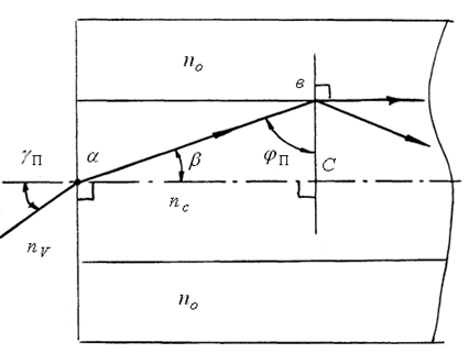 Имеется оптическое волокно со следующими параметрами nс - абсолютный показатель преломления сердцевины волокна, nо - абсолютный показатель преломления оболочки волокна. Определить предельный (критический) угол ( ) падения луча на границу раздела серд