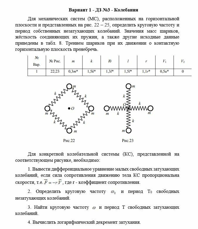 Для механических систем (МС), расположенных на горизонтальной плоскости и представленных на рис. 22 – 25, определить круговую частоту и период собственных незатухающих колебаний. Значения масс шариков, жёсткость соединяющих их пружин, а также другие исходные данные приведены в табл. 8. Трением шариков при их движении о контактную горизонтальную плоскость пренебречь.