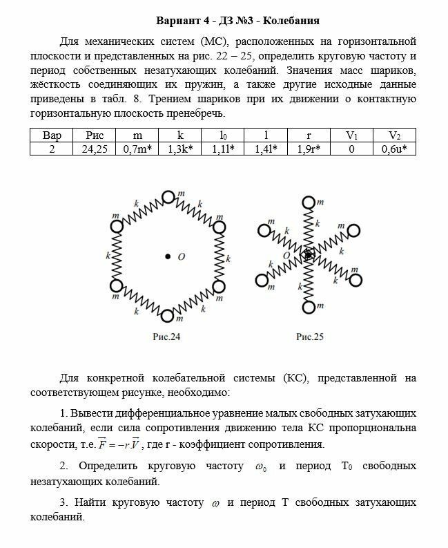 Для механических систем (МС), расположенных на горизонтальной плоскости и представленных на рис. 22 – 25, определить круговую частоту и период собственных незатухающих колебаний. Значения масс шариков, жёсткость соединяющих их пружин, а также другие исходные данные приведены в табл. 8. Трением шариков при их движении о контактную горизонтальную плоскость пренебречь.