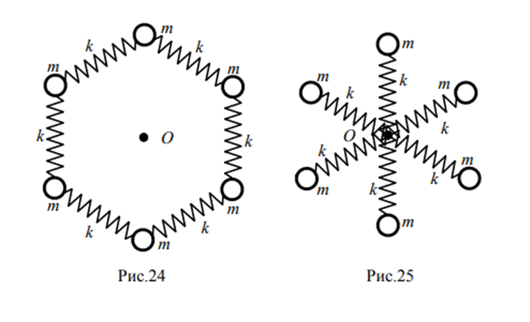 Для механических систем (МС), расположенных на горизонтальной плоскости и представленных на рис. 22 – 25, определить круговую частоту и период собственных незатухающих колебаний. Значения масс шариков, жёсткость соединяющих их пружин, а также другие исходные данные приведены в табл. 8. Трением шариков при их движении о контактную горизонтальную плоскость пренебречь.