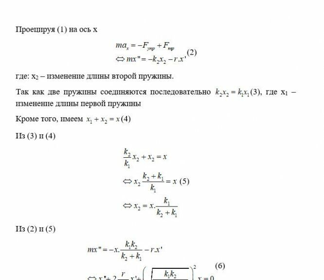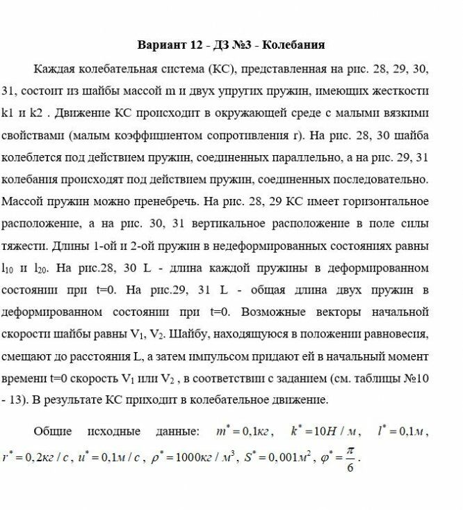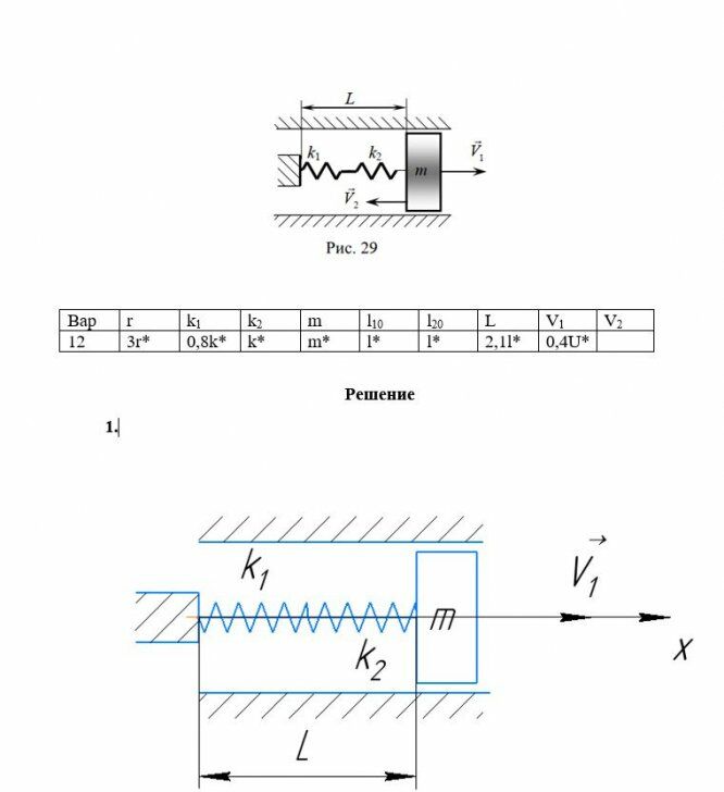 Каждая колебательная система (КС), представленная на рис. 28, 29, 30, 31, состоит из шайбы массой m и двух упругих пружин, имеющих жесткости k1 и k2 . Движение КС происходит в окружающей среде с малыми вязкими свойствами (малым коэффициентом сопротивления r). На рис. 28, 30 шайба колеблется под действием пружин, соединенных параллельно, а на рис. 29, 31 колебания происходят под действием пружин, соединенных последовательно. Массой пружин можно пренебречь. На рис. 28, 29 КС имеет горизонтальное расположение, а на рис. 30, 31 вертикальное расположение в поле силы тяжести. Длины 1-ой и 2-ой пружин в недеформированных состояниях равны l10 и l20. На рис.28, 30 L - длина каждой пружины в деформированном состоянии при t=0. На рис.29, 31 L - общая длина двух пружин в деформированном состоянии при t=0. Возможные векторы начальной скорости шайбы равны V1, V2. Шайбу, находящуюся в положении равновесия, смещают до расстояния L, а затем импульсом придают ей в начальный момент времени t=0 скорость V1 или V2 , в соответствии с заданием (см. таблицы №10 - 13). В результате КС приходит в колебательное движение