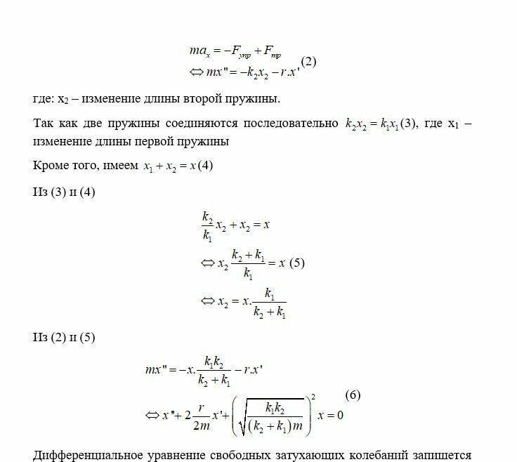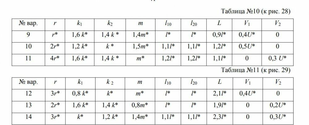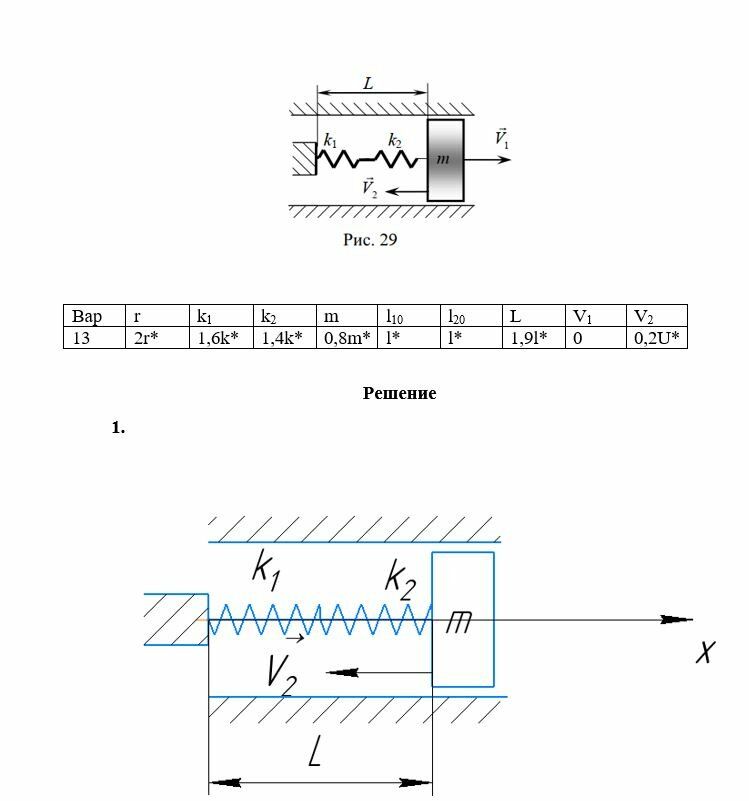 Каждая колебательная система (КС), представленная на рис. 28, 29, 30, 31, состоит из шайбы массой m и двух упругих пружин, имеющих жесткости k1 и k2 . Движение КС происходит в окружающей среде с малыми вязкими свойствами (малым коэффициентом сопротивления r). На рис. 28, 30 шайба колеблется под действием пружин, соединенных параллельно, а на рис. 29, 31 колебания происходят под действием пружин, соединенных последовательно. Массой пружин можно пренебречь. На рис. 28, 29 КС имеет горизонтальное расположение, а на рис. 30, 31 вертикальное расположение в поле силы тяжести. Длины 1-ой и 2-ой пружин в недеформированных состояниях равны l10 и l20. На рис.28, 30 L - длина каждой пружины в деформированном состоянии при t=0. На рис.29, 31 L - общая длина двух пружин в деформированном состоянии при t=0. Возможные векторы начальной скорости шайбы равны V1, V2. Шайбу, находящуюся в положении равновесия, смещают до расстояния L, а затем импульсом придают ей в начальный момент времени t=0 скорость V1 или V2 , в соответствии с заданием (см. таблицы №10 - 13). В результате КС приходит в колебательное движение.