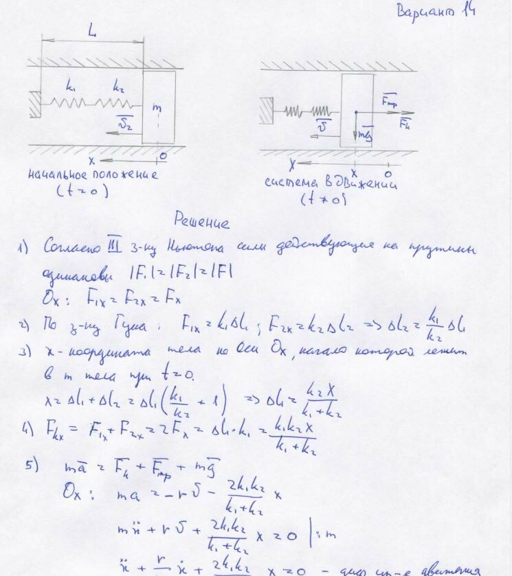 Каждая колебательная система (КС), представленная на рис. 28, 29, 30, 31, состоит из шайбы массой m и двух упругих пружин, имеющих жесткости k1 и k2 . Движение КС происходит в окружающей среде с малыми вязкими свойствами (малым коэффициентом сопротивления r). На рис. 28, 30 шайба колеблется под действием пружин, соединенных параллельно, а на рис. 29, 31 колебания происходят под действием пружин, соединенных последовательно. Массой пружин можно пренебречь. На рис. 28, 29 КС имеет горизонтальное расположение, а на рис. 30, 31 вертикальное расположение в поле силы тяжести. Длины 1-ой и 2-ой пружин в недеформированных состояниях равны l10 и l20. На рис.28, 30 L - длина каждой пружины в деформированном состоянии при t=0. На рис.29, 31 L - общая длина двух пружин в деформированном состоянии при t=0. Возможные векторы начальной скорости шайбы равны V1, V2. Шайбу, находящуюся в положении равновесия, смещают до расстояния L, а затем импульсом придают ей в начальный момент времени t=0 скорость V1 или V2 , в соответствии с заданием (см. таблицы №10 - 13). В результате КС приходит в колебательное движение.
