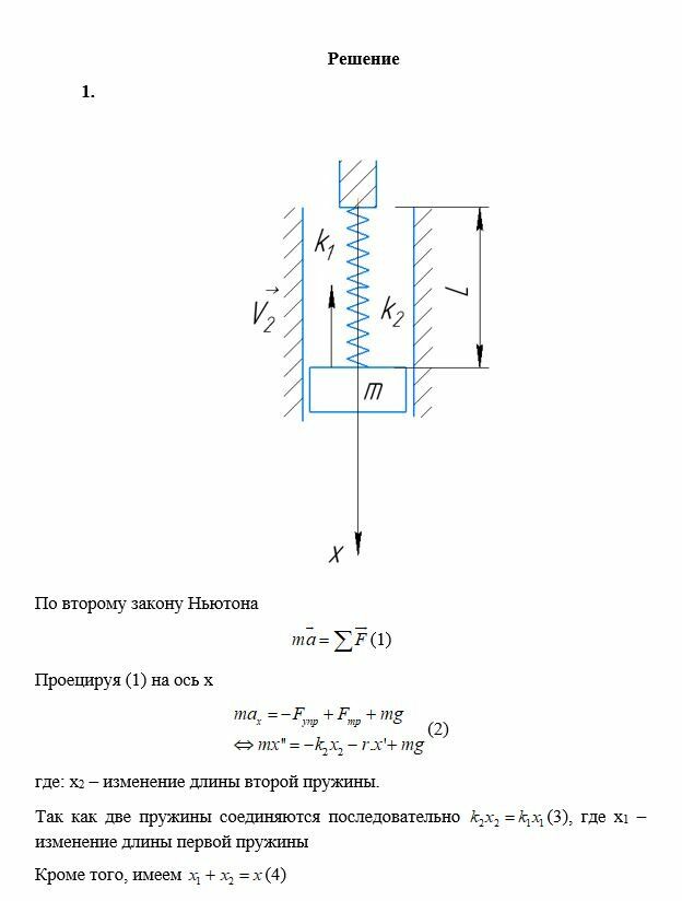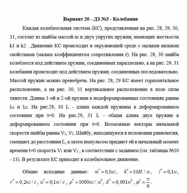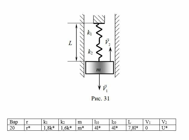 Каждая колебательная система (КС), представленная на рис. 28, 29, 30, 31, состоит из шайбы массой m и двух упругих пружин, имеющих жесткости k1 и k2 . Движение КС происходит в окружающей среде с малыми вязкими свойствами (малым коэффициентом сопротивления r). На рис. 28, 30 шайба колеблется под действием пружин, соединенных параллельно, а на рис. 29, 31 колебания происходят под действием пружин, соединенных последовательно. Массой пружин можно пренебречь. На рис. 28, 29 КС имеет горизонтальное расположение, а на рис. 30, 31 вертикальное расположение в поле силы тяжести. Длины 1-ой и 2-ой пружин в недеформированных состояниях равны l10 и l20. На рис.28, 30 L - длина каждой пружины в деформированном состоянии при t=0. На рис.29, 31 L - общая длина двух пружин в деформированном состоянии при t=0. Возможные векторы начальной скорости шайбы равны V1, V2. Шайбу, находящуюся в положении равновесия, смещают до расстояния L, а затем импульсом придают ей в начальный момент времени t=0 скорость V1 или V2 , в соответствии с заданием (см. таблицы №10 - 13). В результате КС приходит в колебательное движение.