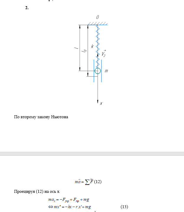 Дополнительно (в соответствии с общими условиями задачи 3) рассчитать все требуемые величины и вывести уравнение затухающих колебаний вертикального пружинного маятника (см. рис. 27), у которого масса шарика равна m = m1, а длина и жёсткость пружины равны соответственно l0 и k (см. табл.9). В начальный момент времени шарик смещают так, что длина пружины становится равной l, а затем кратковременным воздействием сообщают скорость v1 или v2 . В результате система приходит в колебательное движение в вертикальном направлении. Трением шарика о боковую поверхность пренебречь.