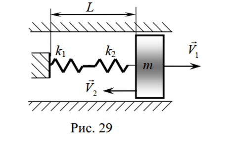 Задача 3-3 для вариантов с 9 по 20Каждая колебательная система (КС), представленная на рис. 28, 29, 30, 31, состоит из шайбы массой m и двух упругих пружин, имеющих жесткости k1 и k2 . Движение КС происходит в окружающей среде с малыми вязкими свойствами (малым коэффициентом сопротивления r). На рис. 28, 30 шайба колеблется под действием пружин, соединенных параллельно, а на рис. 29, 31 колебания происходят под действием пружин, соединенных последовательно. Массой пружин можно пренебречь. На рис. 28, 29 КС имеет горизонтальное расположение, а на рис. 30, 31 вертикальное расположение в поле силы тяжести. Длины 1-ой и 2-ой пружин в недеформированных состояниях равны l10 и l20. На рис.28, 30 L - длина каждой пружины в деформированном состоянии при t=0. На рис.29, 31 L - общая длина двух пружин в деформированном состоянии при t=0. Возможные векторы начальной скорости шайбы равны V1, V2. Шайбу, находящуюся в положении равновесия, смещают до расстояния L, а затем импульсом придают ей в начальный момент времени t=0 скорость V1 или V2 , в соответствии с заданием (см. таблицы №10 - 13). В результате КС приходит в колебательное движение.