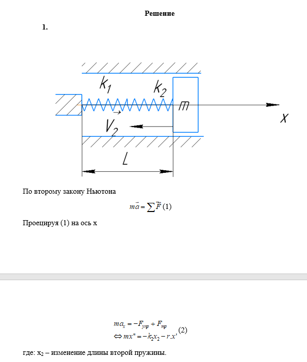 Каждая колебательная система (КС), представленная на рис. 28, 29, 30, 31, состоит из шайбы массой m и двух упругих пружин, имеющих жесткости k1 и k2 . Движение КС происходит в окружающей среде с малыми вязкими свойствами (малым коэффициентом сопротивления r). На рис. 28, 30 шайба колеблется под действием пружин, соединенных параллельно, а на рис. 29, 31 колебания происходят под действием пружин, соединенных последовательно. Массой пружин можно пренебречь. На рис. 28, 29 КС имеет горизонтальное расположение, а на рис. 30, 31 вертикальное расположение в поле силы тяжести. Длины 1-ой и 2-ой пружин в недеформированных состояниях равны l10 и l20. На рис.28, 30 L - длина каждой пружины в деформированном состоянии при t=0. На рис.29, 31 L - общая длина двух пружин в деформированном состоянии при t=0. Возможные векторы начальной скорости шайбы равны V1, V2. Шайбу, находящуюся в положении равновесия, смещают до расстояния L, а затем импульсом придают ей в начальный момент времени t=0 скорость V1 или V2 , в соответствии с заданием (см. таблицы №10 - 13). В результате КС приходит в колебательное движение.