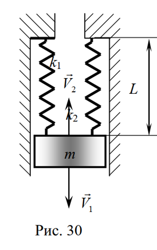 Каждая колебательная система (КС), представленная на рис. 28, 29, 30, 31, состоит из шайбы массой m и двух упругих пружин, имеющих жесткости k1 и k2 . Движение КС происходит в окружающей среде с малыми вязкими свойствами (малым коэффициентом сопротивления r). На рис. 28, 30 шайба колеблется под действием пружин, соединенных параллельно, а на рис. 29, 31 колебания происходят под действием пружин, соединенных последовательно. Массой пружин можно пренебречь. На рис. 28, 29 КС имеет горизонтальное расположение, а на рис. 30, 31 вертикальное расположение в поле силы тяжести. Длины 1-ой и 2-ой пружин в недеформированных состояниях равны l10 и l20. На рис.28, 30 L - длина каждой пружины в деформированном состоянии при t=0. На рис.29, 31 L - общая длина двух пружин в деформированном состоянии при t=0. Возможные векторы начальной скорости шайбы равны V1, V2. Шайбу, находящуюся в положении равновесия, смещают до расстояния L, а затем импульсом придают ей в начальный момент времени t=0 скорость V1 или V2 , в соответствии с заданием (см. таблицы №10 - 13). В результате КС приходит в колебательное движение.