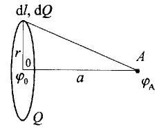 Главная » Учебные материалы » Физика » Решения задач » Несколько классов/семестров » Кольцо радиусом r = 5см из тонкой проволоки несет равномерно заряд Q = 10нКл. Определите потенциал φ электростатического поля: 1) в центре кольца; 2) на оси, проходящей через центр кольца, в точке, удаленной на расстояние a = 10см от центра кольца.