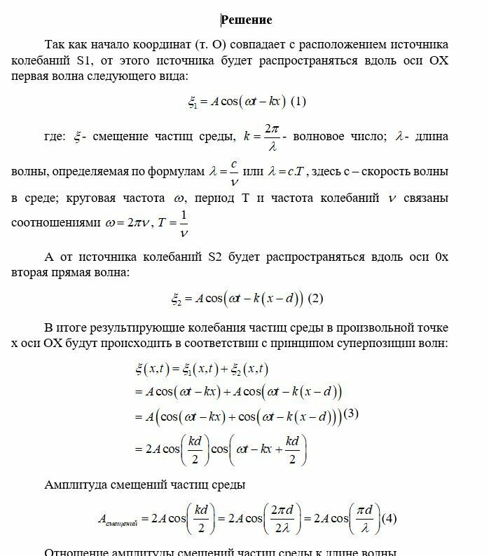 В среде на расстоянии d друг от друга находятся одинаковые излучатели плоских продольных, акустических, монохроматических волн (S1 и S2, рис.34). Оба излучателя колеблются по закону , где - смещение излучателя из положения равновесия при колебаниях, A - амплитуда, ω - круговая частота при колебаниях излучателя.