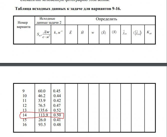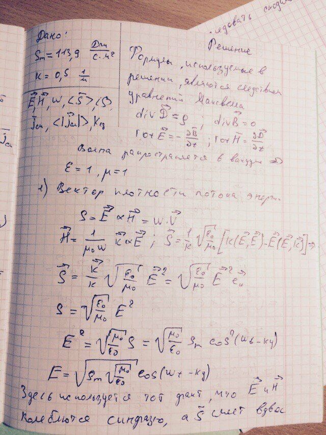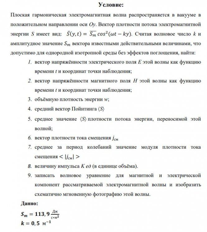 Условие: Плоская гармоническая электромагнитная волна распространяется в вакууме в положительном направлении оси Oy. Вектор плотности потока электромагнитной энергии S имеет вид: . Считая волновое число k и амплитудное значение вектора известными действительными величинами, что допустимо для однородной изотропной среды без эффектов поглощения, найти:
