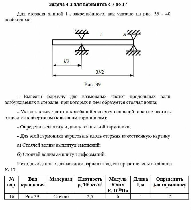 № вар. | Вид крепления | Материал | Плотность ρ, 103 кг/м3 | Модуль Юнга Е, 1010Па | Длина l, м | Определить i-ю гармонику |