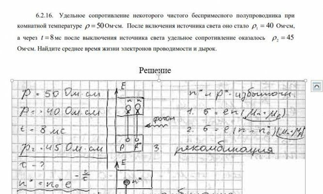 Задача 6.2.16. Удельное сопротивление некоторого чистого беспримесного полупроводника при комнатной температуре 50 Ом∙см. После включения источника света оно стало 1 40 Ом∙см, а через t 8 мс после выключения источника света удельное сопротивление оказалось 2 45 Ом∙см. Найдите среднее время жизни электронов проводимости и дырок.