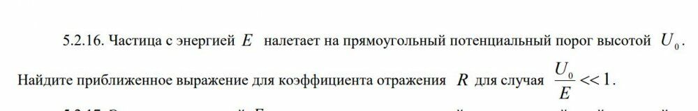 Задача 5.2.16. Частица с энергией E налетает на прямоугольный потенциальный порог высотой U0 . Найдите приближенное выражение для коэффициента отражения R для случая 1 0 E U .