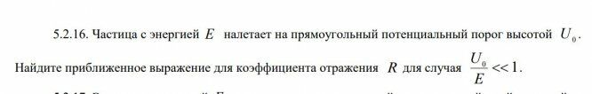 Задача 5.2.16. Частица с энергией E налетает на прямоугольный потенциальный порог высотой U0 . Найдите приближенное выражение для коэффициента отражения R для случая 1 0  E U .