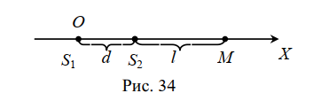 В среде на расстоянии d друг от друга находятся одинаковые излучатели плоских продольных, акустических, монохроматических волн (S1 и S2, рис.34). Оба излучателя колеблются по закону , где - смещение излучателя из положения равновесия при колебаниях, A - амплитуда, ω - круговая частота при колебаниях излучателя.