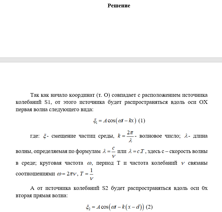 В среде на расстоянии d друг от друга находятся одинаковые излучатели плоских продольных, акустических, монохроматических волн (S1 и S2, рис.34). Оба излучателя колеблются по закону , где - смещение излучателя из положения равновесия при колебаниях, A - амплитуда, ω - круговая частота при колебаниях излучателя.