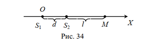 В среде на расстоянии d друг от друга находятся одинаковые излучатели плоских продольных, акустических, монохроматических волн (S1 и S2, рис.34). Оба излучателя колеблются по закону , где - смещение излучателя из положения равновесия при колебаниях, A - амплитуда, ω - круговая частота при колебаниях излучателя.