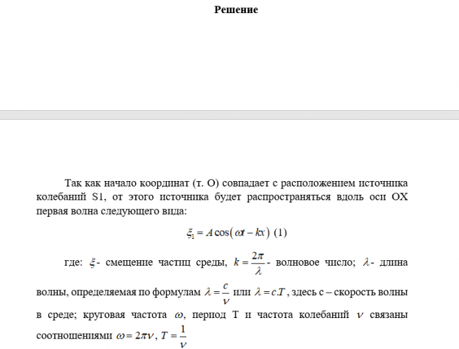 В среде на расстоянии d друг от друга находятся одинаковые излучатели плоских продольных, акустических, монохроматических волн (S1 и S2, рис.34). Оба излучателя колеблются по закону , где - смещение излучателя из положения равновесия при колебаниях, A - амплитуда, ω - круговая частота при колебаниях излучателя.