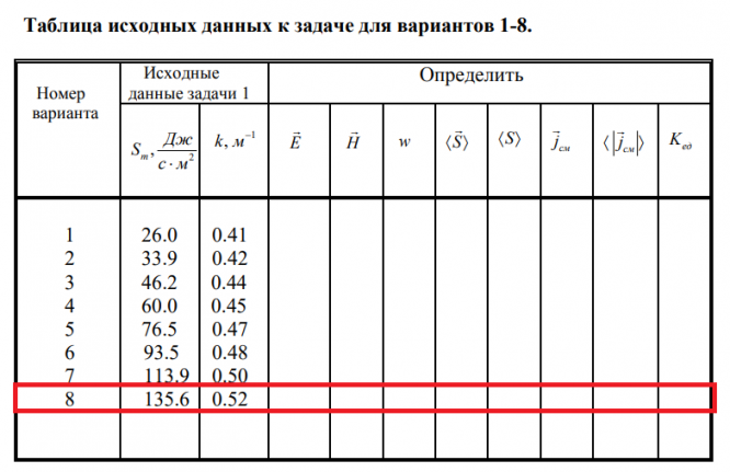 9) записать волновое уравнение для магнитной и электрической компонент рассматриваемой электромагнитной волны и изобразить схематично мгновенную фотографию этой волны. Таблица исходных данных к задаче для вариантов 1-8..