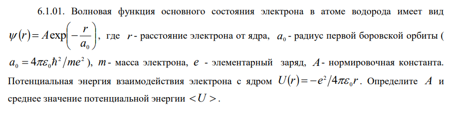 6.1.01. Волновая функция основного состояния электрона в атоме водорода имеет вид             0 exp a r  r A , где r- расстояние электрона от ядра, a0 - радиус первой боровской орбиты ( 2 2 a0  4 0 me ), m - масса электрона, e - элементарный заряд, A- нормировочная константа. Потенциальная энергия взаимодействия электрона с ядром Ur e r0 2   4 . Определите A и среднее значение потенциальной энергии U  .