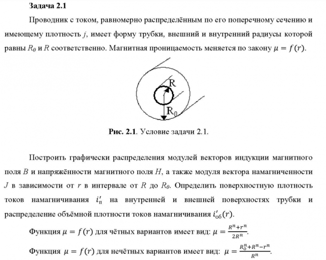 Проводник с током, равномерно распределённым по его поперечному сечению и имеющему плотность j, имеет форму трубки, внешний и внутренний радиусы которой равны R0 и R соответственно. Магнитная проницаемость меняется по закону =f(r). Построить графически распределения модулей векторов индукции магнитного поля B и напряжённости магнитного поля H, а также модуля вектора намагниченности J в зависимости от r в интервале от R до R0. Определить поверхностную плотность токов намагничивания i\'п на внутренней и внешней поверхностях трубки и распределение объёмной плотности токов намагничивания i\'об(r). Функция =f(r) для чётных вариантов имеет вид: =(Rn +rn )/2Rn .