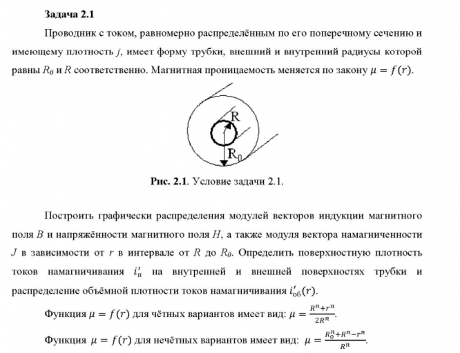 Задача 2.1. Проводник с током, равномерно распределённым по его поперечному сечению и имеющему плотность j, имеет форму трубки, внешний и внутренний радиусы которой равны R0 и R соответственно. Магнитная проницаемость меняется по закону =f(r). Построить графически распределения модулей векторов индукции магнитного поля B и напряжённости магнитного поля H, а также модуля вектора намагниченности J в зависимости от r в интервале от R до R0. Определить поверхностную плотность токов намагничивания i\'п на внутренней и внешней поверхностях трубки и распределение объёмной плотности токов намагничивания i\'об(r). Функция =f(r) для чётных вариантов имеет вид: =(Rn +rn )/2Rn .