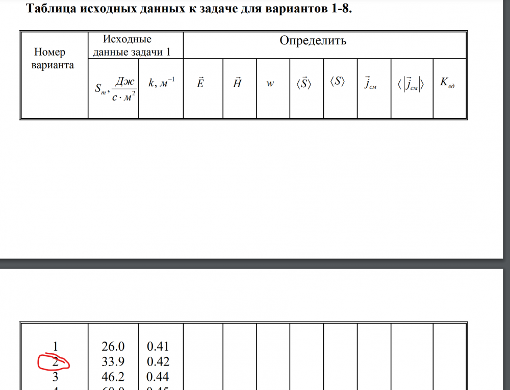 Плоская гармоническая электромагнитная волна распространяется в вакууме в положительном направлении оси Ox. Вектор плотности потока электромагнитной энергии S имеет вид: S x t S t k x m ( , ) cos ( 2 ). Считая волновое число k и амплитудное значение m S вектора S известными и действительными величинами, что допустимо для однородной изотропной среды без эффектов поглощения, найти: 1) вектор напряжённости электрического поля E этой волны как функцию времени t и координат точки наблюдения; 2) вектор напряжённости магнитного поля H этой волны как функцию времени t и координат точки наблюдения; 3) объёмную плотность энергии w ; 4 средний вектор Пойнтинга S ; 5) среднее значение S плотности потока энергии, переносимой этой волной; 6) вектор плотности тока смещения см j ; 7) среднее за период колебаний значение модуля плотности тока смещения см j ; 8) величину импульса Kед (в единице объёма). 9) записать волновое уравнение для магнитной и электрической компонент рассматриваемой электромагнитной волны и изобразить схематично мгновенную фотографию этой волны