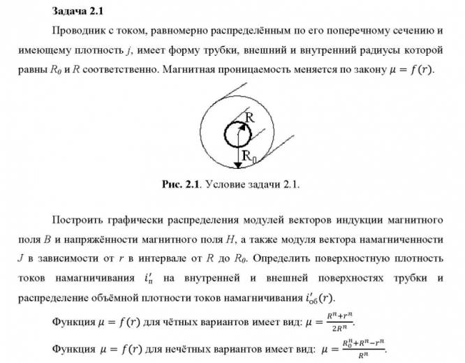 Задача 2.1. Проводник с током, равномерно распределённым по его поперечному сечению и имеющему плотность j, имеет форму трубки, внешний и внутренний радиусы которой равны R0 и R соответственно. Магнитная проницаемость меняется по закону =f(r). Построить графически распределения модулей векторов индукции магнитного поля B и напряжённости магнитного поля H, а также модуля вектора намагниченности J в зависимости от r в интервале от R до R0. Определить поверхностную плотность токов намагничивания i\'п на внутренней и внешней поверхностях трубки и распределение объёмной плотности токов намагничивания i\'об(r). Функция =f(r) для чётных вариантов имеет вид: =(Rn +rn )/2Rn .