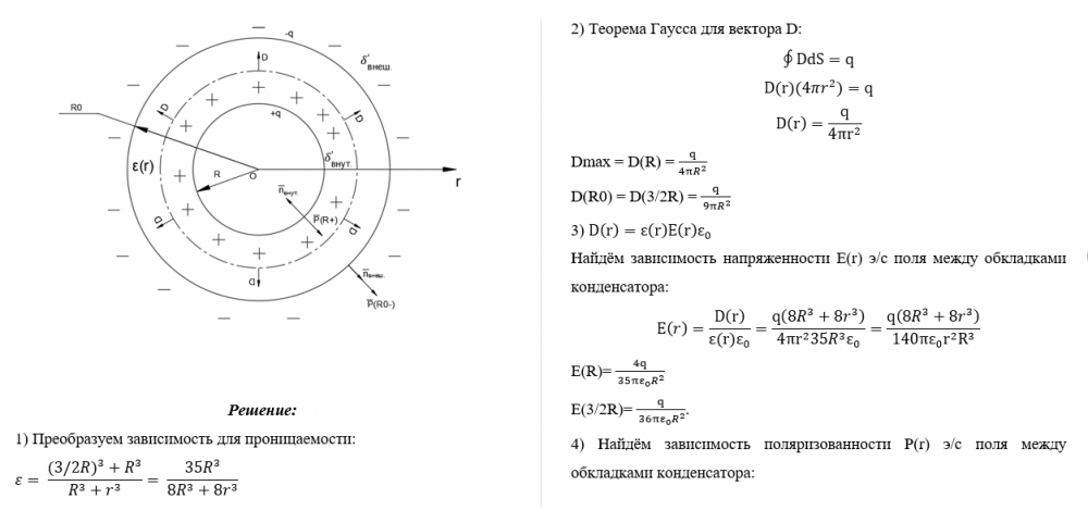 Сферический диэлектрический конденсатор имеет радиусы внешней и внутренней обкладок R0 и R соответственно. Заряд конденсатора равен q. Диэлектрическая проницаемость меняется между обкладками по закону ԑ=f(r).