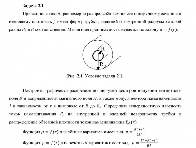 Задача 2.1. Проводник с током, равномерно распределённым по его поперечному сечению и имеющему плотность j, имеет форму трубки, внешний и внутренний радиусы которой равны R0 и R соответственно. Магнитная проницаемость меняется по закону =f(r). Построить графически распределения модулей векторов индукции магнитного поля B и напряжённости магнитного поля H, а также модуля вектора намагниченности J в зависимости от r в интервале от R до R0. Определить поверхностную плотность токов намагничивания i\'п на внутренней и внешней поверхностях трубки и распределение объёмной плотности токов намагничивания i\'об(r). Функция =f(r) для чётных вариантов имеет вид: =(Rn +rn )/2Rn .