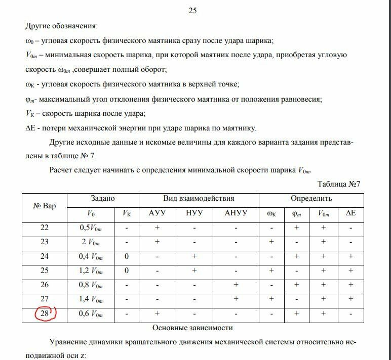 V0m – минимальная скорость шарика, при которой маятник после удара, приобретая угловую скорость ω0m, совершает полный оборот;