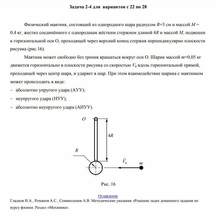 Маятник может свободно без трения вращаться вокруг оси O. Шарик массой m=0,05 кг движется горизонтально в плоскости рисунка со скоростью V0 вдоль горизонтальной прямой, проходящей через центр шара, и ударяет в шар. При этом взаимодействие шарика с маятником может происходить в виде: