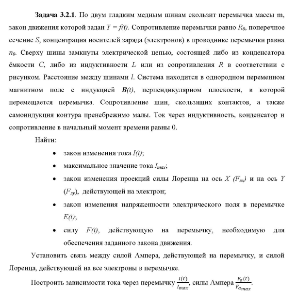 Найти: - закон изменения тока I (t); - максимальное значение тока I max; - закон изменения проекций силы Лоренца на ось X (Fлx) и на ось Y (Fлy), действующей на электрон ; - закон изменения напряженности электрического поля в перемычке E(t); - силу F(t), действующую на перемычку, необходимую для обеспечения заданного закона движения ; - установить связь между силой Ампера, действующей на перемычку, и силой Лоренца, действующей на все электроны в перемычке. Z L C R X B B B Ro Ro Ro Y Рис.3.2.1 Рис.3.2.2 Рис.3.2.3 Закон движения перемычки для всех вариантов Y = a exp(- nt); Закон изменения магнитного поля для нечетных вариантов ВZ = c exp(- mt), для четных вариантов ВZ = -c exp(- mt).