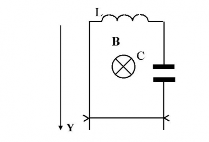 По двум гладким медным шинам, установленным вертикально в однородном магнитном поле В, скользит под действием силы тяжести медная перемычка массы m, которая замыкает электрическую цепь, приведенную на рисунке. Расстояние между шинами l. Сопротивления шин, перемычки и скользящих контактов, а также самоиндукция контура пренебрежимо малы. Найти закон движения перемычки Y(t) при условии, что начальная скорость, ток через индуктивность и заряд на конденсаторе равны 0, Y(0)=Y0.