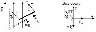 Прямолинейный проводник длиной L = 0,5 м массой m = 20 г висит горизонтально на двух параллельных нитях равной длины. Магнитное поле с индукцией В = 0,4 Тл создано в вертикальном направлении. На какой угол отклонятся нити с проводником от вертикали, если по проводнику пропустить ток I = 1 А?