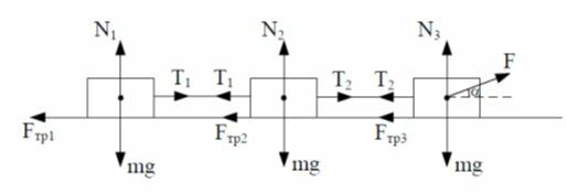 Три груза массой М=1 кг каждый связаны нитью и движутся по горизонтальной поверхности под действием силы F=10 Н, направленной под углом α=30 градусов к горизонту. Определить ускорение системы и силы напряжения нити Т1 и Т2, если коэффициент трения μ=