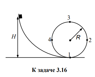 3.17. Тело массой т без трения соскальзывает с высоты H = 2,5R по вертикальному желобу, переходящему в вертикальную петлю (см. рис. к задаче 3.16). Найдите силу давления тела на желоб в точках 1, 2, 3, 4.