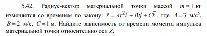 5.42. Радиус-вектор материальной точки массой m = 1 кг изменяется со временем по закону: r At i Btj Ck     = + + 2 , где A= 3 м/c 2 , B = 2 м/c, C =1 м. Найдите зависимость от времени момента импульса материальной точки относительно оси Z.