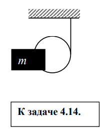 4.14. На диск массой m = 6 кг намотана нить, один конец которой прикреплен к потолку (см. рис.). Предоставленный самому себе диск падает вниз, разматывая нить. Считая, что нить все время остается вертикальной, найдите ускорение центра масс диска при его падении и натяжение нити. ![]()