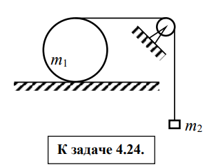 4.24. На горизонтальной плоскости лежит цилиндр массой m1 = 10,0 кг. На цилиндр намотана нить, к свободному концу которой прикреплен груз массой m2 = 5,0 кг. Нить перекидывается через невесомый блок и система предоставляется самой себе (см. рис.). Предполагая, что цилиндр катится по плоскости без проскальзывания, определите силу трения между плоскостью и цилиндром. Задачу решите для двух случаев: а) цилиндр сплошной; б) цилиндр полый. ![]()
