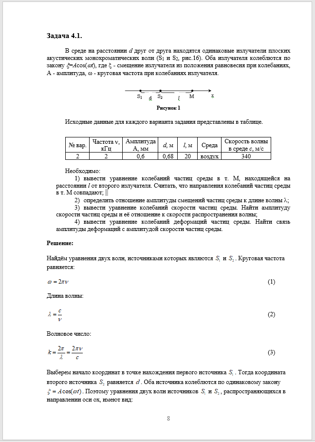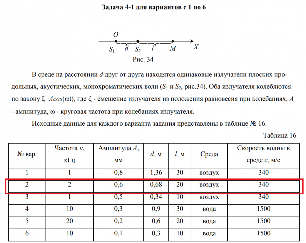 В среде на расстоянии d друг от друга находятся одинаковые излучатели плоских продольных, акустических, монохроматических волн (S1 и S2, рис.34). Оба излучателя колеблются по закону x=Acos(wt), где x - смещение излучателя из положения равновесия при колебаниях, A - амплитуда, w - круговая частота при колебаниях излучателя..