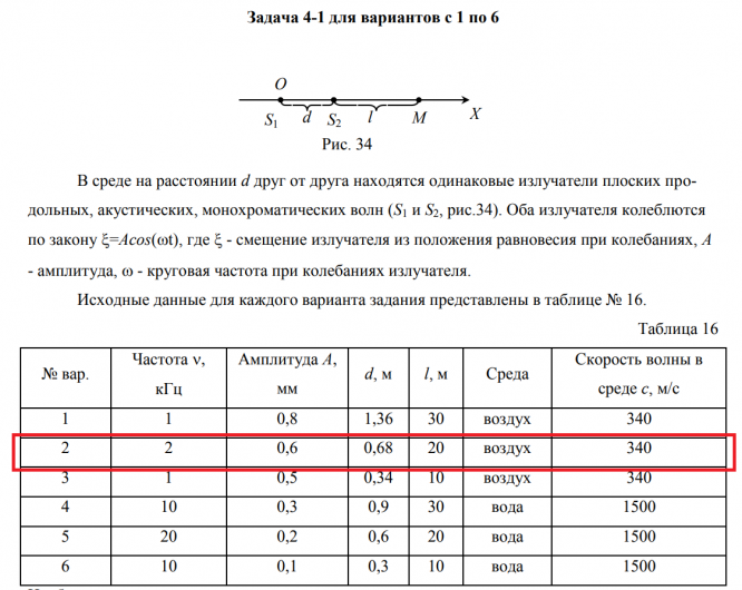 В среде на расстоянии d друг от друга находятся одинаковые излучатели плоских продольных, акустических, монохроматических волн (S1 и S2, рис.34). Оба излучателя колеблются по закону x=Acos(wt), где  x - смещение излучателя из положения равновесия при колебаниях, A - амплитуда, w - круговая частота при колебаниях излучателя..