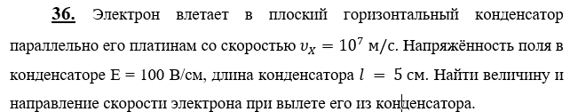 Показать/скрыть дополнительное описаниеЭлектрон влетает в плоский горизонтальный конденсатор параллельно его платинам со скоростью . Напряжённость поля в конденсаторе Е = 100 В/см, длина конденсатора . Найти величину и направление скорости электрона при вылете его из конденсатора..