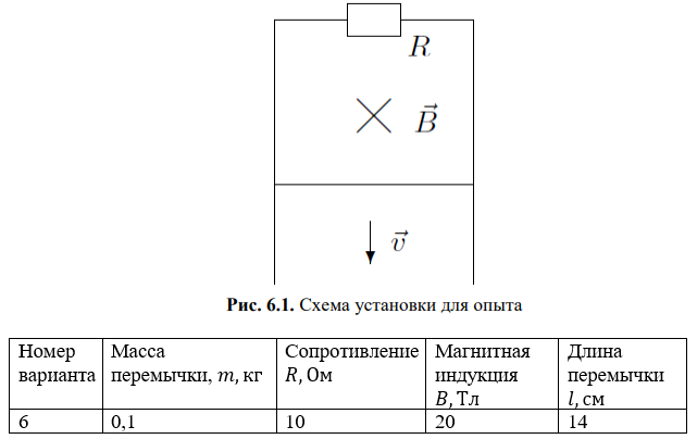 Задача. По двум гладким вертикальным проводам, отстоящим друг от друга на расстояние l, скользит под действием силы тяжести проводник перемычка массы m. Вверху провода замкнуты на сопротивление R. Система находится в однородном магнитном поле с индукцией B, перпендикулярном плоскости, в которой перемещается перемычка. Пренебрегая сопротивлением проводов, перемычки и скользящих контактов, а также магнитным полем индукционного тока, найти установившуюся скорость перемычки. Схема установки приведена на рис. 6.1.