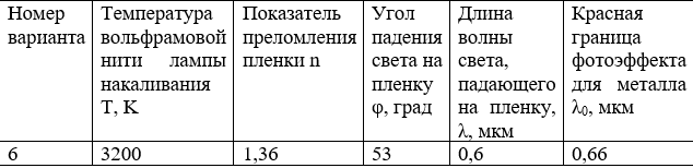 Задача. Параллельный пучок белого света, полученный от лампы накаливания с вольфрамовой нитью, нагретой до температуры Т, падает на находящуюся в воздухе тонкую пленку с показателем преломления n под углом . Испытывающий при этом максимальное отражение от поверхности пленки свет с длиной волны λ направляется на поверхность металла с красной границей фотоэффекта – . Определить минимальную толщину пленки – d, работу выхода электрона из металла – А и долю энергии фотона – , расходуемую на сообщение электрону кинетической энергии – . Определить энергетическую светимость – R вольфрамовой нити лампы накаливания (считая ее абсолютно черным телом – АЧТ) и длину волны, соответствующую максимуму ее энергии излучения, – .