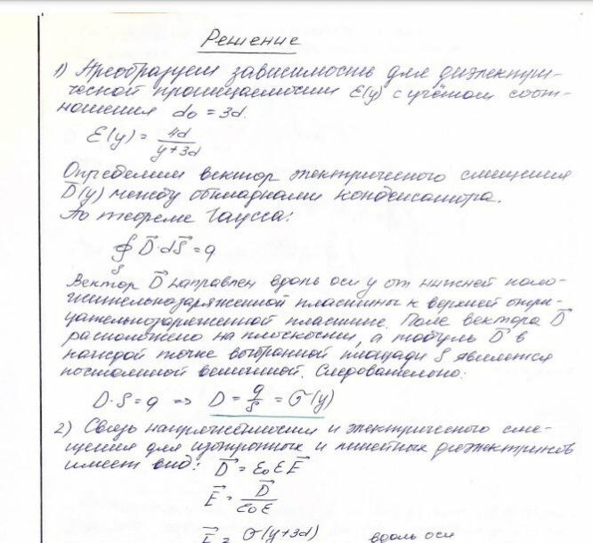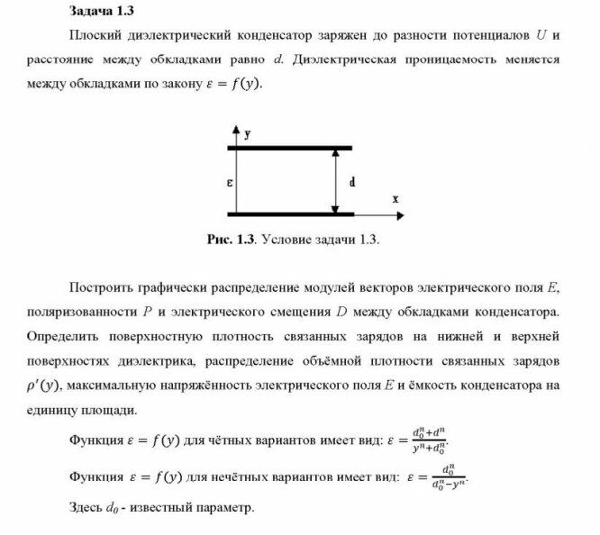 Построить графически распределение модулей векторов электрического поля Е, поляризованности Р и электрического смещения D между обкладками конденсатора. Определить поверхностную плотность связанных зарядов на нижней и верхней поверхностях диэлектрика, распределение объёмной плотности связанных зарядов , максимальную напряжённость электрического поля Е и ёмкость конденсатора на единицу площади.