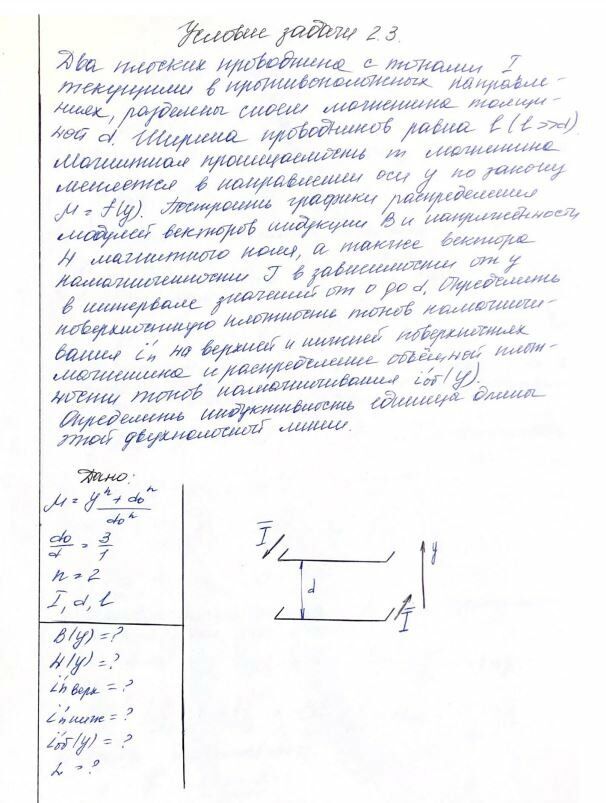 Два плоских проводника с токами I, текущими в противоположных направлениях, разделены слоем магнетика толщиной d. Ширина проводников равна L (L>>d). Магнитная проницаемость m магнетика меняется в направлении оси у по закону