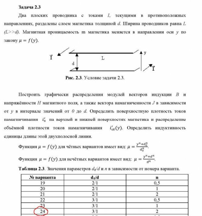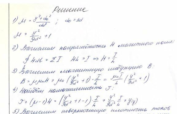 Построить графически распределения модулей векторов индукции B и напряжённости H магнитного поля, а также вектора намагниченности J в зависимости от у в интервале значений от 0 до d. Определить поверхностную плотность токов намагничивания на верхней и нижней поверхностях магнетика и распределение объёмной плотности токов намагничивания .Определить индуктивность единицы длины этой двухполосной линии.