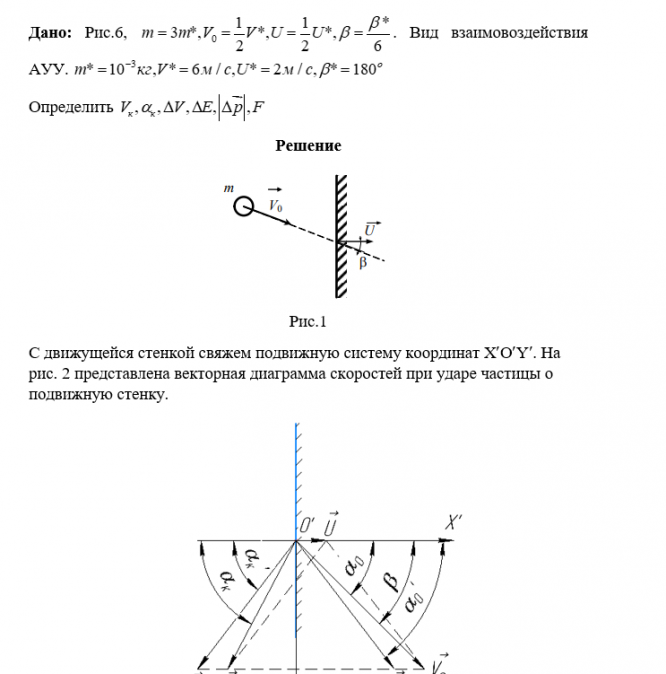 Гладкая частица сферической формы массой m, которую можно рассматривать как материальную точку, ударяется со скоростью V0  о гладкую массивную преграду, которая движется со скоростью U const  . Угол, образованный векторами V0  и U  , равен . Массу преграды считать бесконечной. На рис. 5, 6 преграда имеет форму плоской стенки, на рис.7 – форму острого конуса с углом раствора γ, а на рис. 8 – форму конуса сферической головной частью радиусом R. Удар частицы о сферическую поверхность происходит в точке А, расположенной под углом γ относительно оси преграды. При этом АО = R. Виды взаимодействия: а) абсолютно упругий удар (АУУ); б) неупругий удар (НУУ); в) абсолютно неупругий удар (АНУУ). Обозначения: VK  - конечная скорость частицы после удара; K - угол, образованный векторами VK  и U  ; V   - изменение вектора скорости частицы за время удара; p   - изменение модуля импульса частицы за время удара; E - изменение кинетической энергии частицы за время удара;